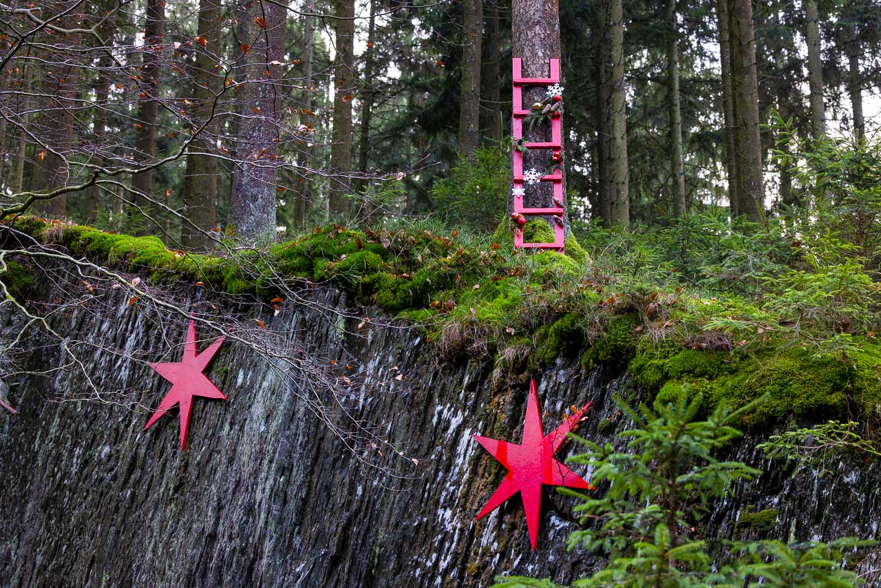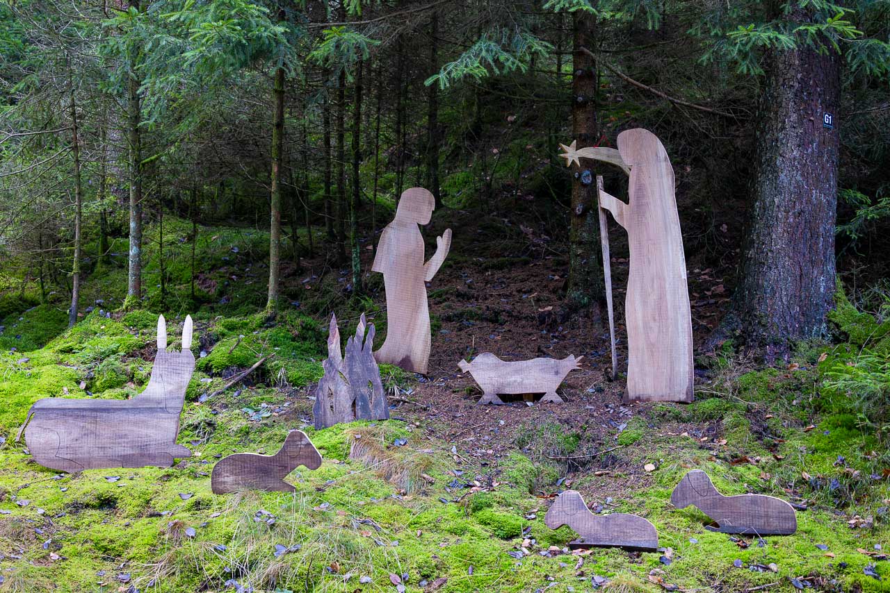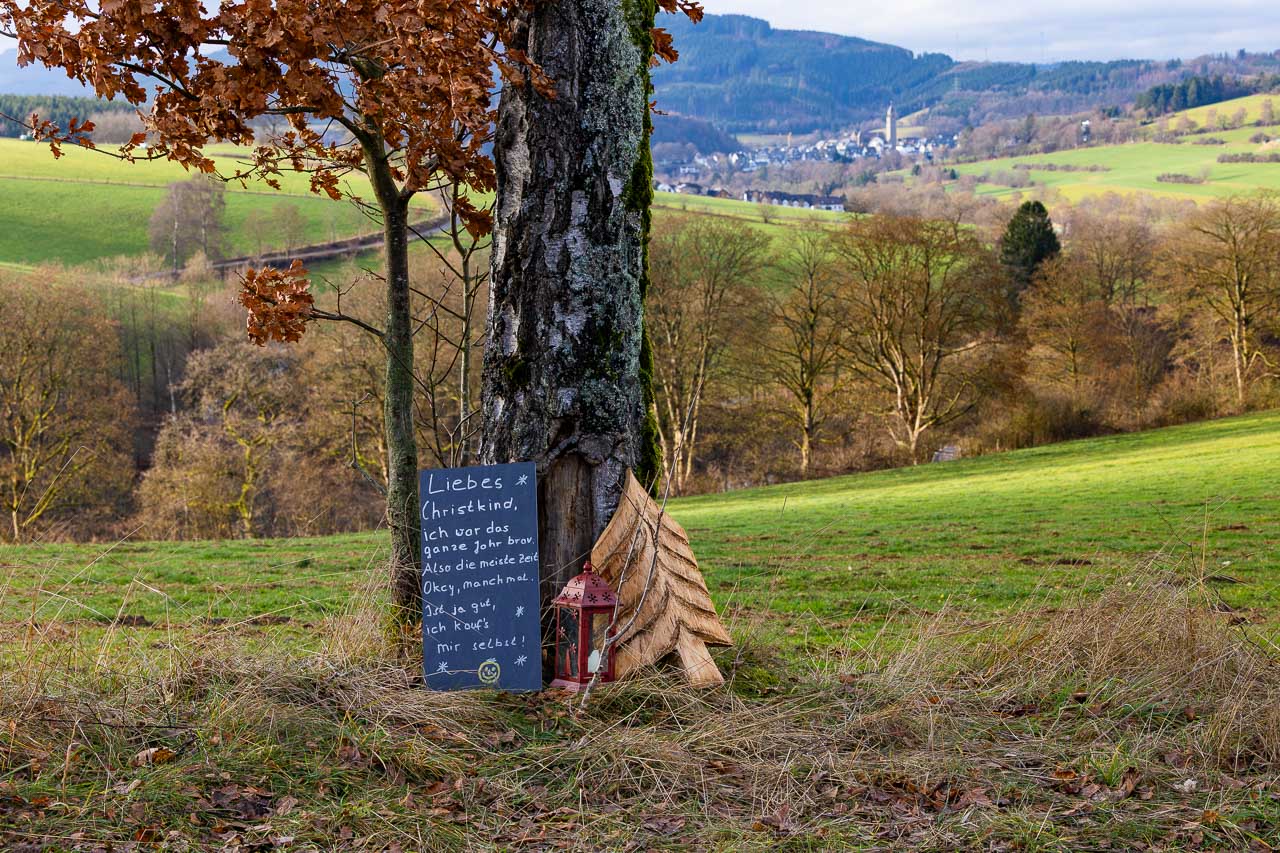 Zur Adventszeit gibt es auf auf dem Grafschafter Weihnachtsweg wieder viel zu entdecken. Auf einem stimmungsvollen Waldspaziergang begegnen einem kleine Wichtel mit dicken Knollennasen, geschmückte Tannenbäumchen, Schneemänner und schöne Geschichten und Zitate zur Weihnachtszeit. Besonders beeindruckend sind eine Krippe, ein kleines Hexenhäuschen und ein Gruß- und Wunschbaum. Neben den Wünschen der Kinder wie Puppe oder Roller, kann man auch sehr oft das Wort „Frieden“ lesen – bei dieser unruhigen Weltlage wohl der größte und innigste Wunsch.