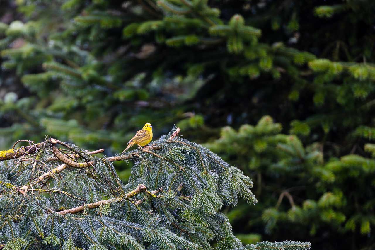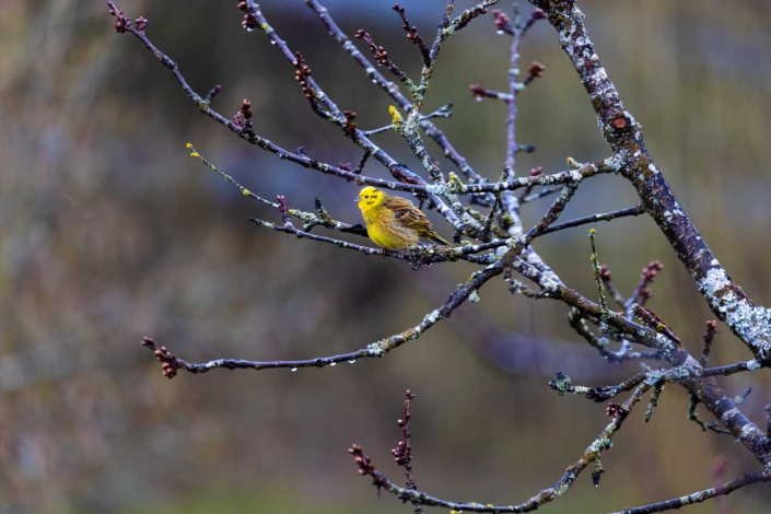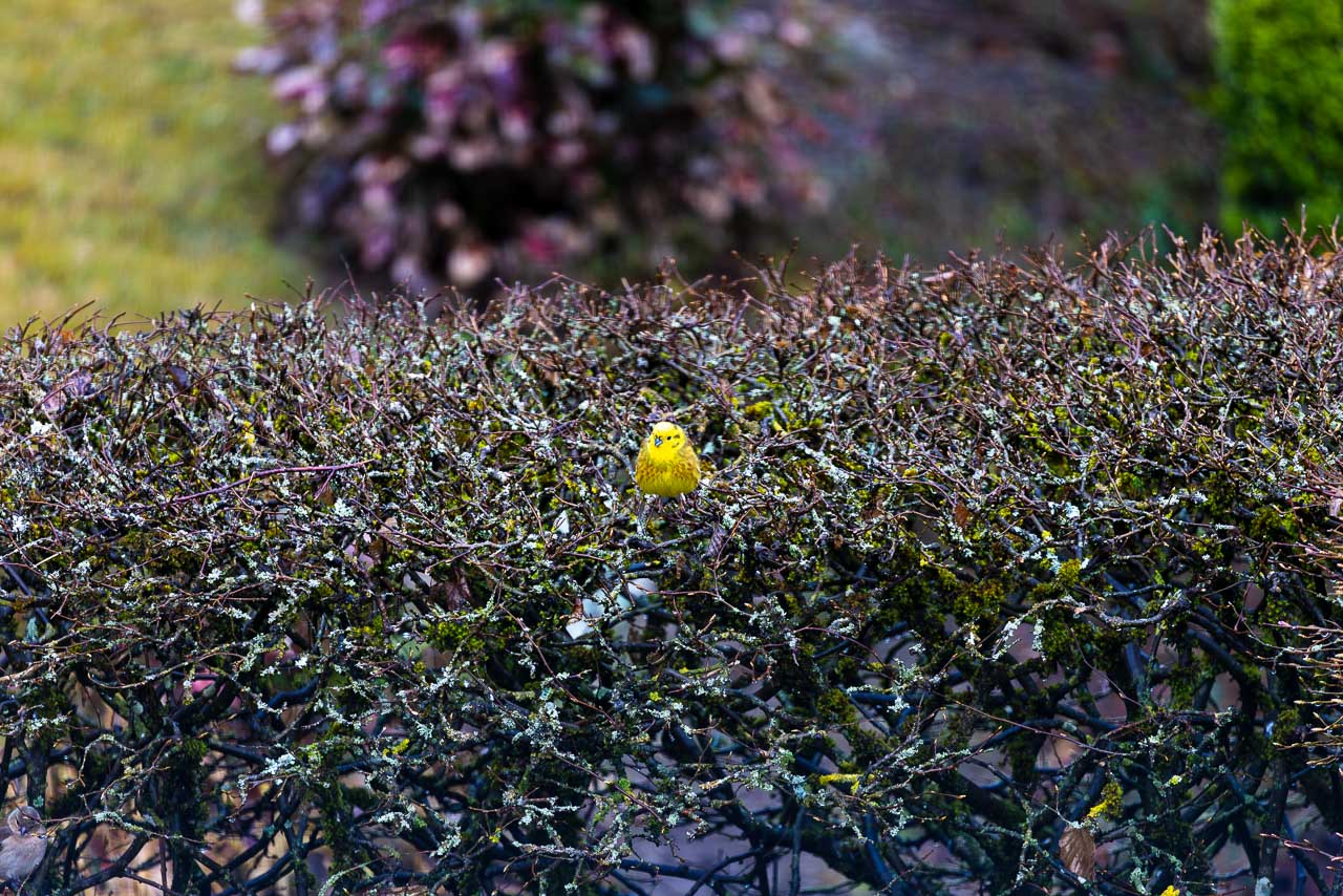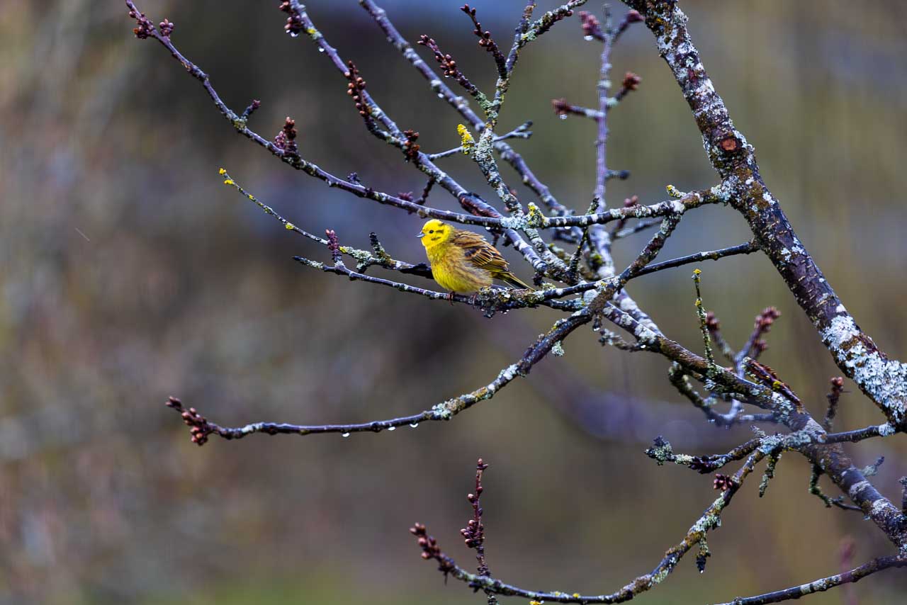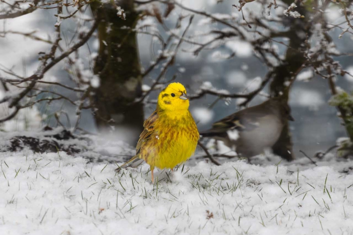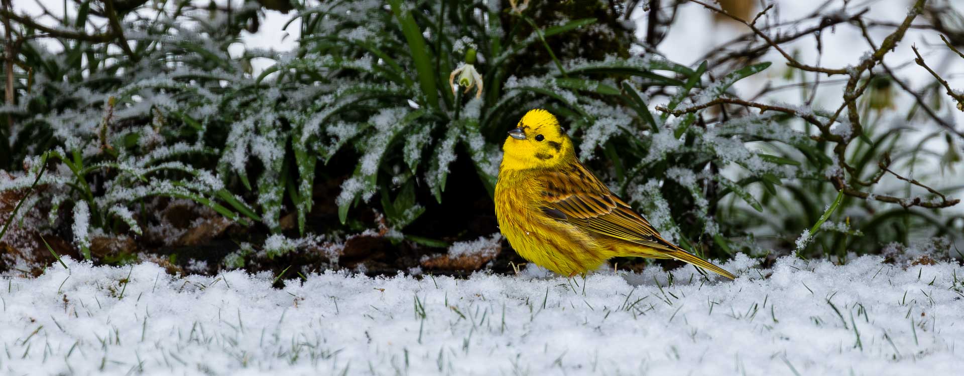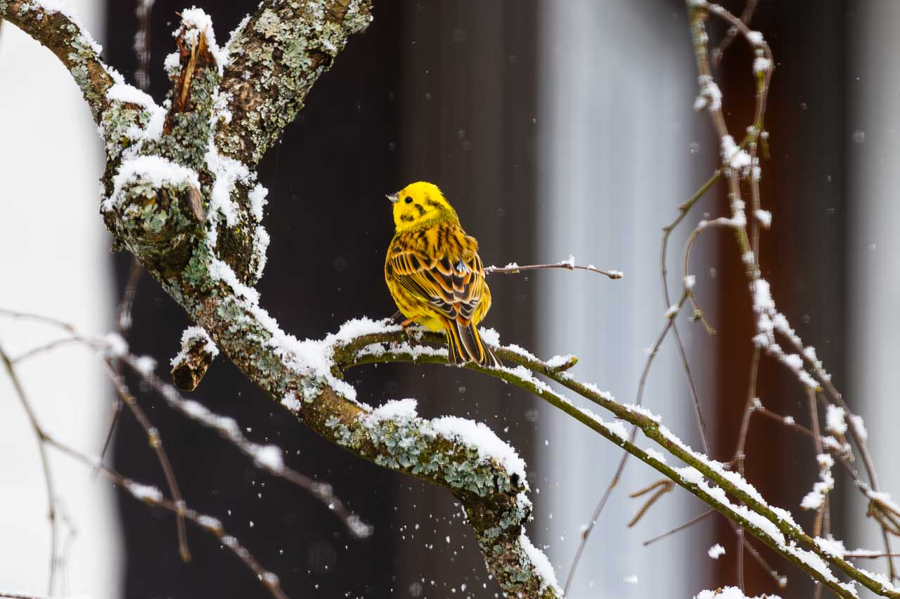 Draußen macht das Wetter heute, was es will: Regen und Schnee wechseln sich laufend ab und alles wirkt ziemlich grau. Doch in unserem Garten gibt es etwas zu sehen, das sofort für gute Laune sorgt. Eigentlich beobachte ich diesen kleinen Kerl schon seit mehreren Tagen, wie er sich regelmäßig am Vogelhäuschen stärkt oder flink durch die nassen Zweige hüpft. Er leuchtet so stark, dass man ihn gar nicht übersehen kann. Besonders sein Kopf ist strahlend gelb. Es ist eine Goldammer, die hier bei uns im Garten unterwegs ist.
