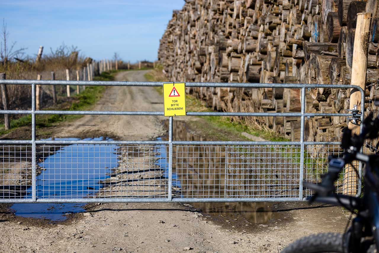 Allerdings wird das Naturerlebnis etwas ausgebremst: Überall ziehen sich kilometerlange Maschendrahtzäune wegen der Afrikanischen Schweinepest durch den Wald und geben das Gefühl, in gettoartigen Korridoren unterwegs zu sein. Diese massiven Barrieren dienen dazu, die Infektionskette zu unterbrechen und die Ausbreitung der Seuche in andere Gebiete zu verhindern. Wer die Wege nutzt, passiert dabei Tore, die den Durchlass gewähren, aber natürlich nur dann einen Sinn ergeben, wenn sie auch konsequent geschlossen werden.