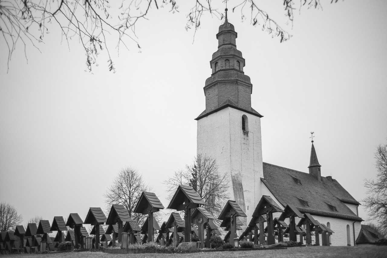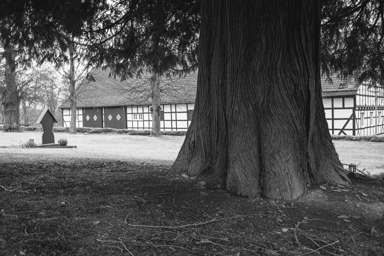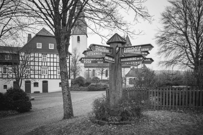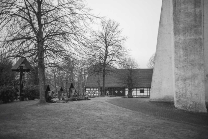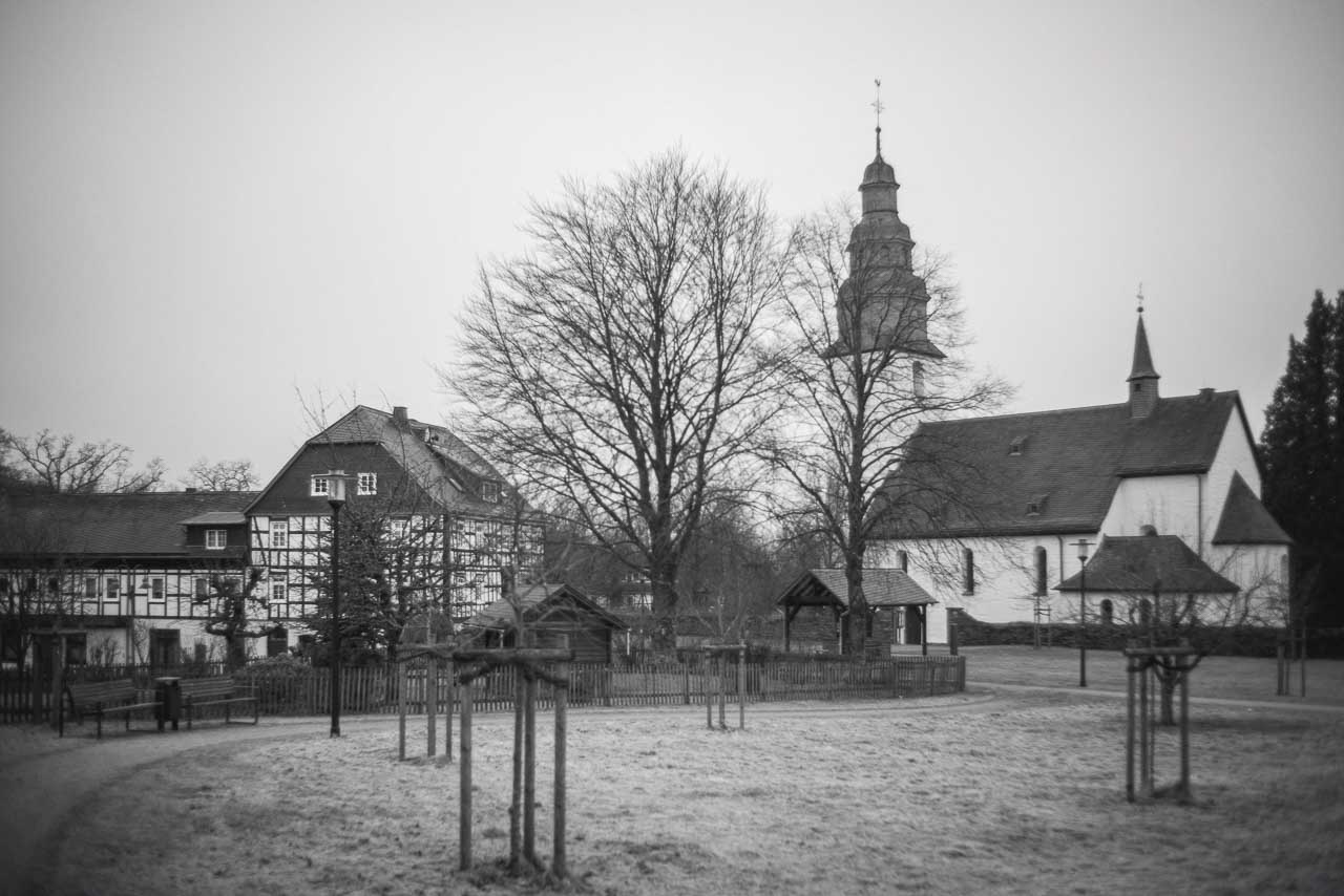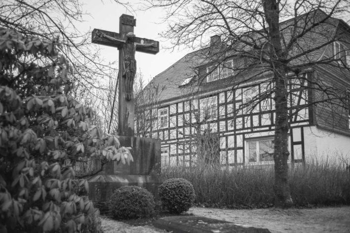 Auf meinem letzten fotografischen Streifzug durch das Schmallenberger Sauerland hatte ich ein echtes Stück Fotogeschichte auf die Kamera geschraubt: das Ashai Super-Takumar 35mm f/2.0. Dieses Vintage-Objektiv zeichnet sich nicht nur durch seine mechanische Präzision aus, sondern weist auch eine chemische Besonderheit auf: Die Verwendung von schwach radioaktivem Thorium im Glas. Mit der Zeit verleiht dieses Material der Linse eine charakteristische gelbliche Tönung, die den Bildern einen unverwechselbaren, warmen Nostalgie-Look verleiht. Die Strahlung ist allerdings so minimal, dass man beim Fotografieren wahrscheinlich eine höhere Dosis durch das natürliche Sonnenlicht abbekommt – mein Geigerzähler bleibt jedenfalls tiefentspannt und ich leuchte nach dem Fotografieren auch nicht im Dunkeln. Aber genau dieses kleine „strahlende“ Extra macht das Takumar zur idealen Wahl für das entschleunigte Fotografieren, bei dem man sich bewusst Zeit für das Motiv nimmt. Mit dieser Kamera-Kombination im Gepäck führte mich mein Weg nach Wormbach, um dort die mystische und geheimnisvolle Stimmung der Kirche und des Kirchhofs einzufangen.