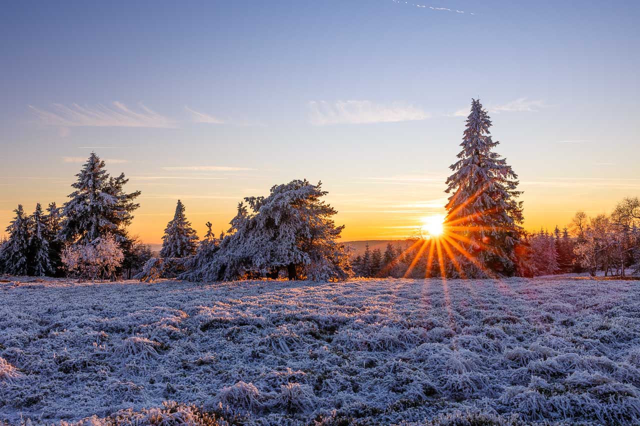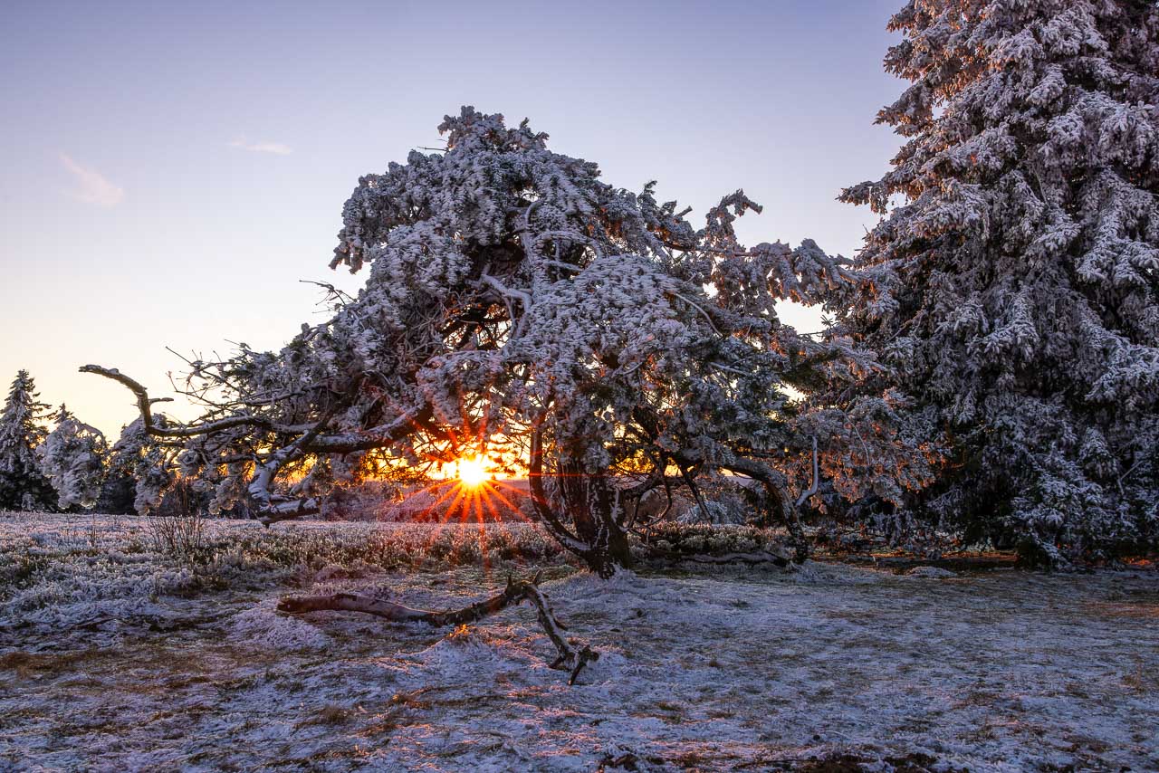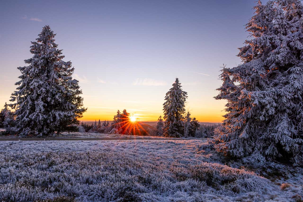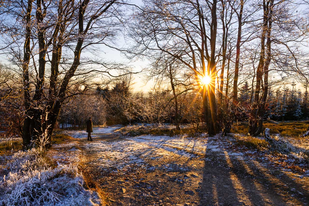 Ein Winterspaziergang am Kahlen Asten entfaltet seinen ganz eigenen Zauber. Die klare Winterluft und die mit Reif bedeckte Astenheide schaffen eine märchenhafte Atmosphäre. Am späten Nachmittag scheint die tief stehende Sonne zwischen den Bäumen hindurch; Licht bricht sich an Zweigen und Nadeln – perfekte Bedingungen für „Sonnen-Sternchen-Fotografie“.