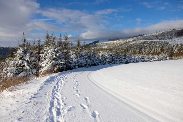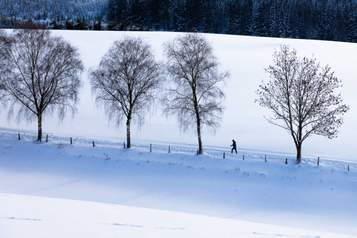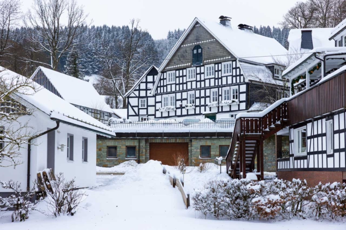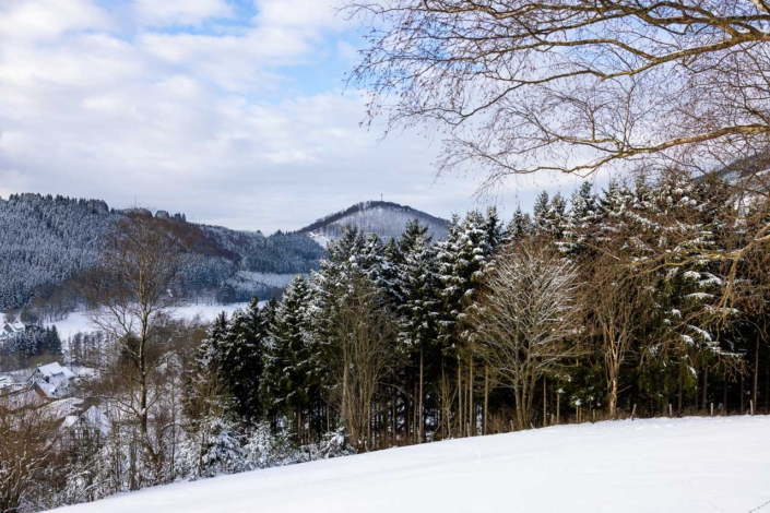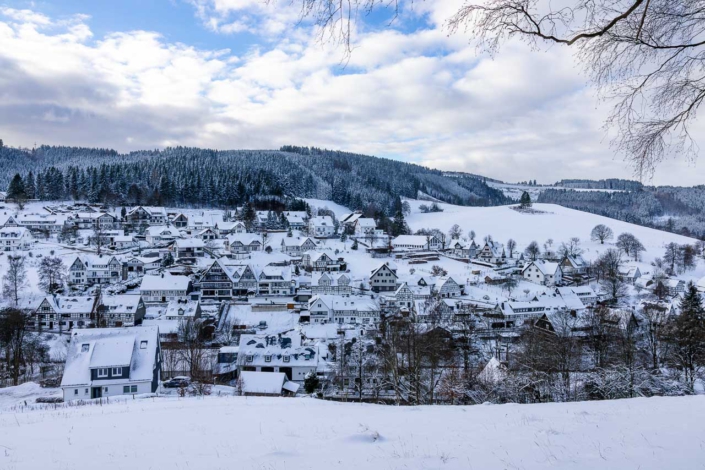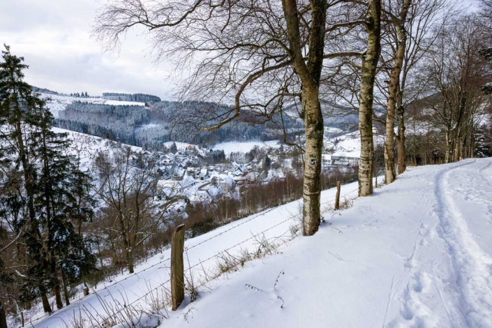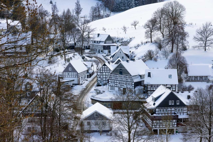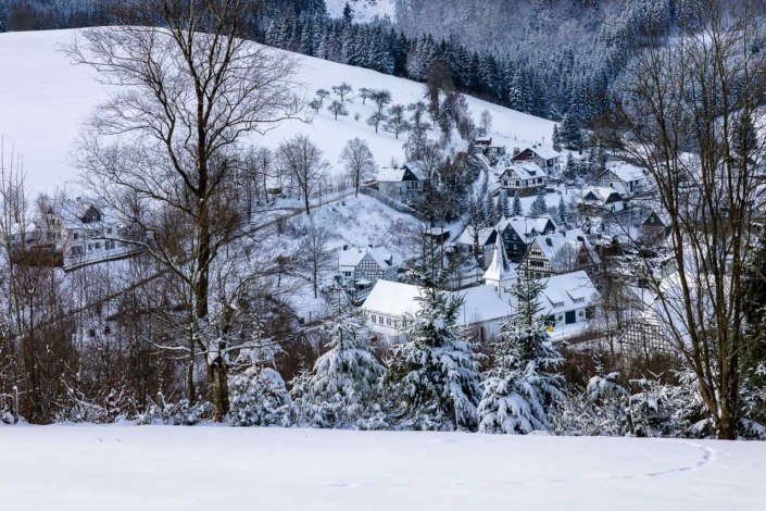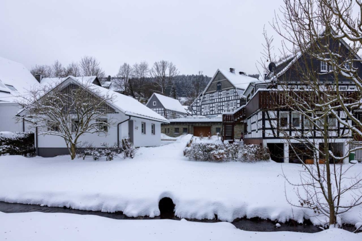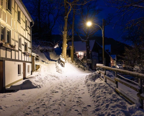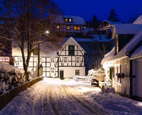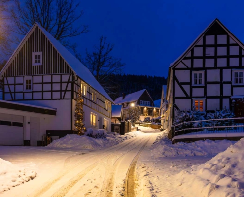 Westfeld liegt eingebettet im Tal der Lenne und ist das erste Dorf, das der Fluss auf seinem Weg durchquert. Es zählt sicher zu den schönsten Ecken im Schmallenberger Sauerland. Vor allem im Winter macht die Kombination aus gepflegtem Fachwerk und der verschneiten Landschaft den Ort zu einem echten Hingucker. Ich mag besonders die Stimmung während der blauen Stunde. Vor einigen Tagen bin ich direkt nach einem Schneeschauer losgegangen, genau als die Dämmerung einsetzte und sich der Himmel in dieses tiefe, kühle Blau färbte. Da die Straßen noch von einer dünnen Schneeschicht bedeckt waren, sah das Ganze einfach herrlich aus – die Stimmung war in diesem Moment noch schöner als sonst. Es war einer dieser Augenblicke, in denen das Dorf eine ganz besondere Ruhe ausstrahlte, die man am liebsten festhalten möchte.