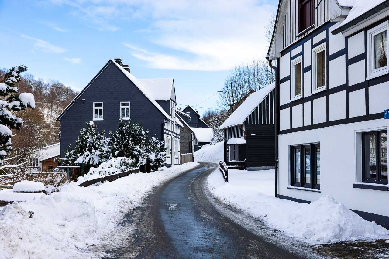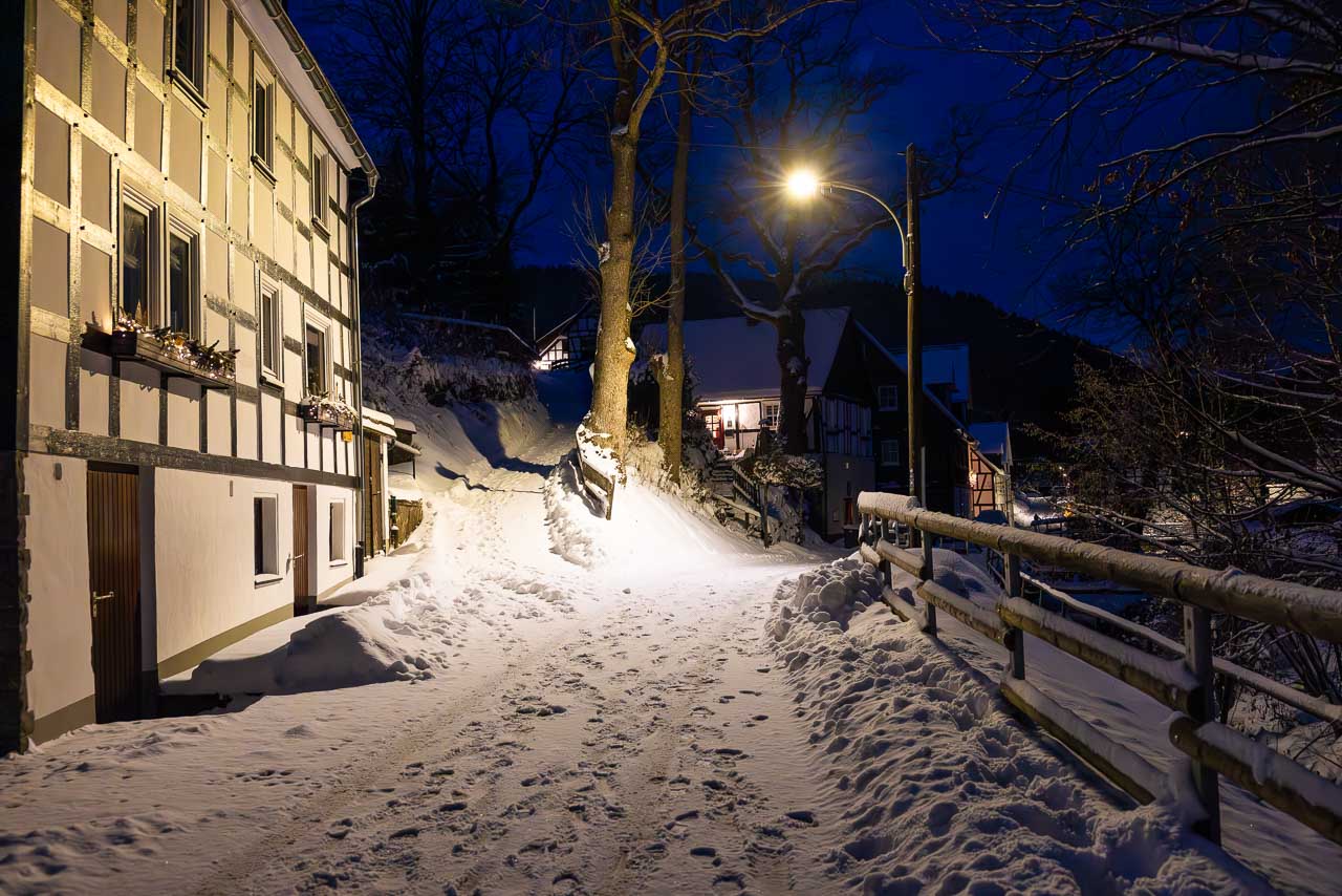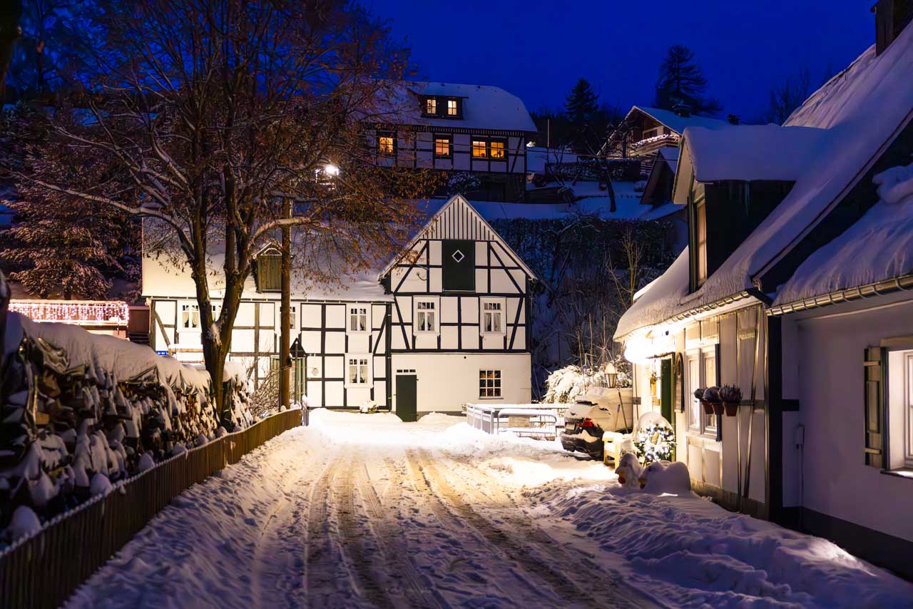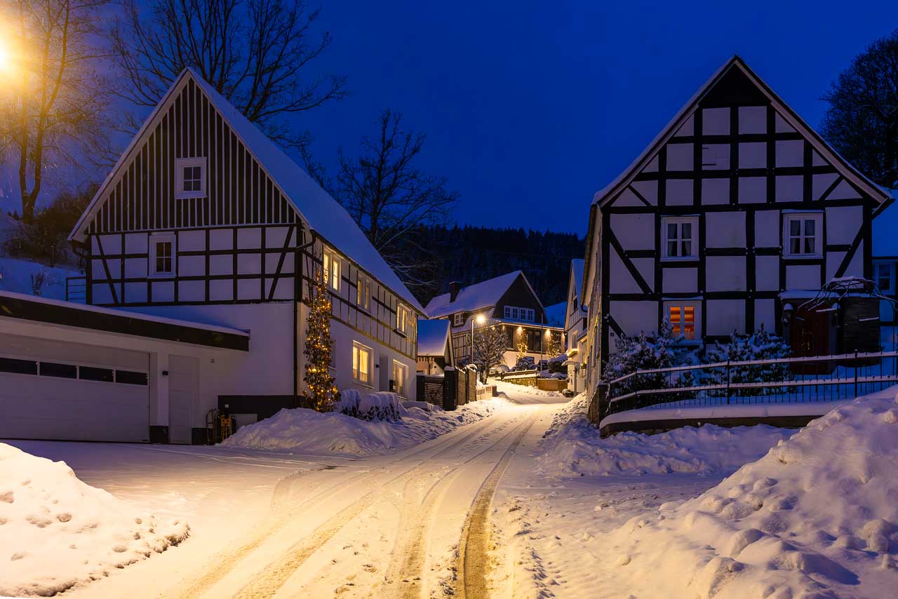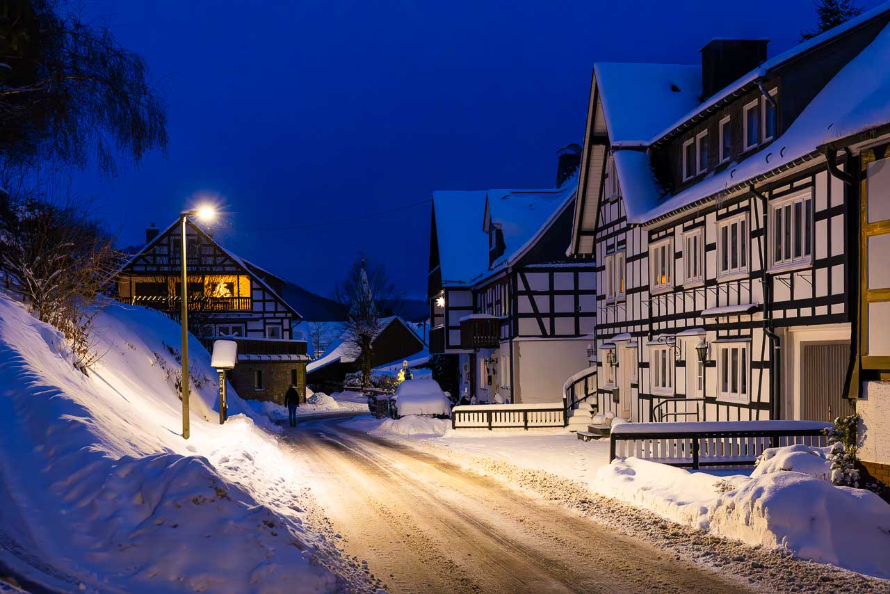 Westfeld liegt eingebettet im Tal der Lenne und ist das erste Dorf, das der Fluss auf seinem Weg durchquert. Es zählt sicher zu den schönsten Ecken im Schmallenberger Sauerland. Vor allem im Winter macht die Kombination aus gepflegtem Fachwerk und der verschneiten Landschaft den Ort zu einem echten Hingucker. Ich mag besonders die Stimmung während der blauen Stunde. Vor einigen Tagen bin ich direkt nach einem Schneeschauer losgegangen, genau als die Dämmerung einsetzte und sich der Himmel in dieses tiefe, kühle Blau färbte. Da die Straßen noch von einer dünnen Schneeschicht bedeckt waren, sah das Ganze einfach herrlich aus – die Stimmung war in diesem Moment noch schöner als sonst. Es war einer dieser Augenblicke, in denen das Dorf eine ganz besondere Ruhe ausstrahlte, die man am liebsten festhalten möchte.