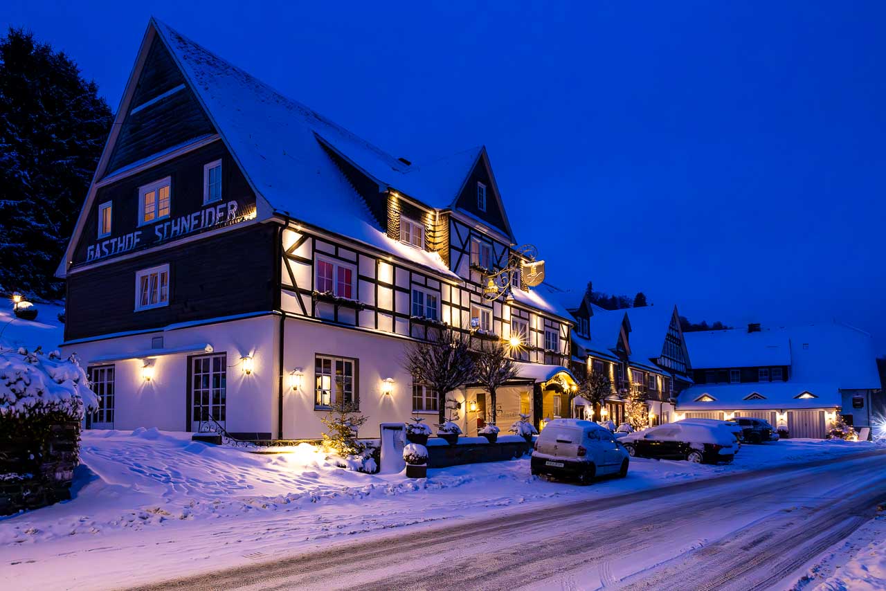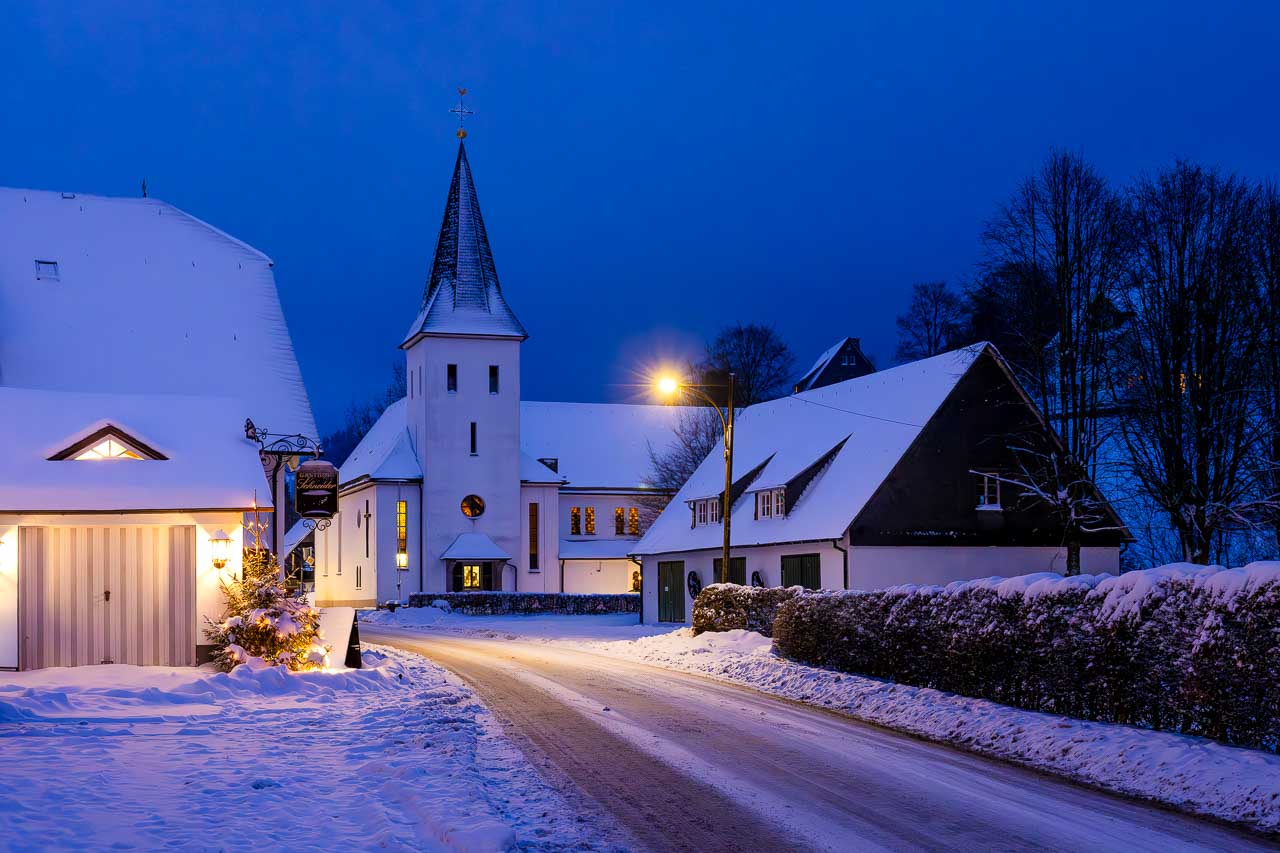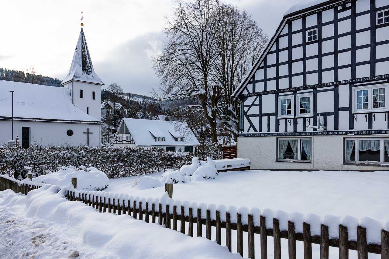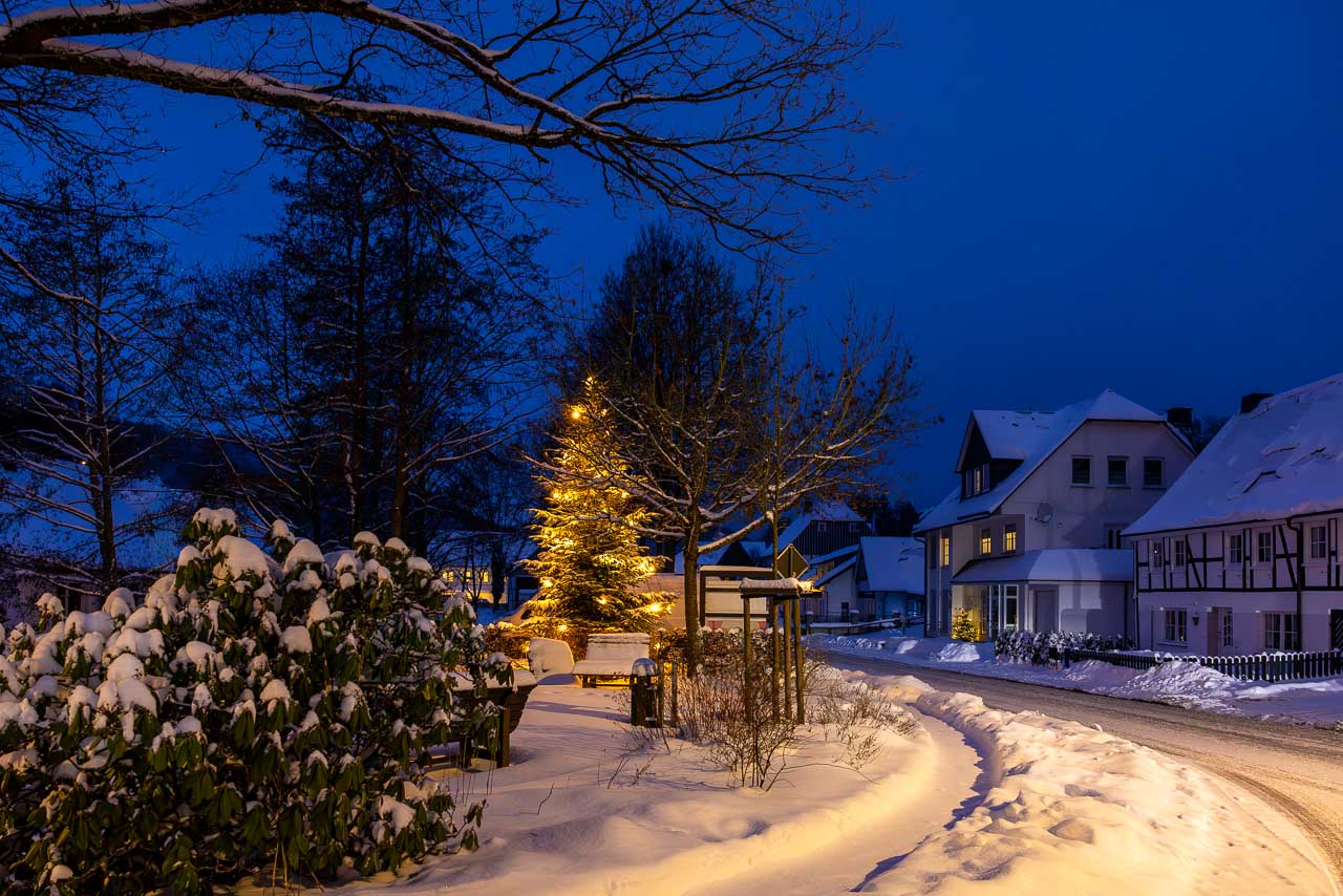 Westfeld liegt eingebettet im Tal der Lenne und ist das erste Dorf, das der Fluss auf seinem Weg durchquert. Es zählt sicher zu den schönsten Ecken im Schmallenberger Sauerland. Vor allem im Winter macht die Kombination aus gepflegtem Fachwerk und der verschneiten Landschaft den Ort zu einem echten Hingucker. Ich mag besonders die Stimmung während der blauen Stunde. Vor einigen Tagen bin ich direkt nach einem Schneeschauer losgegangen, genau als die Dämmerung einsetzte und sich der Himmel in dieses tiefe, kühle Blau färbte. Da die Straßen noch von einer dünnen Schneeschicht bedeckt waren, sah das Ganze einfach herrlich aus – die Stimmung war in diesem Moment noch schöner als sonst. Es war einer dieser Augenblicke, in denen das Dorf eine ganz besondere Ruhe ausstrahlte, die man am liebsten festhalten möchte.