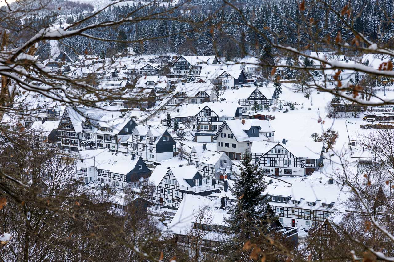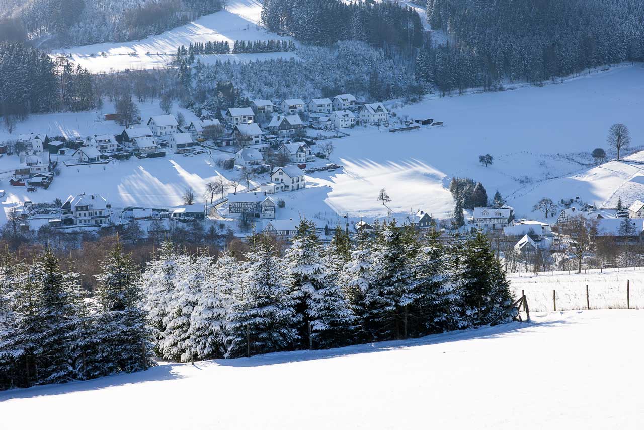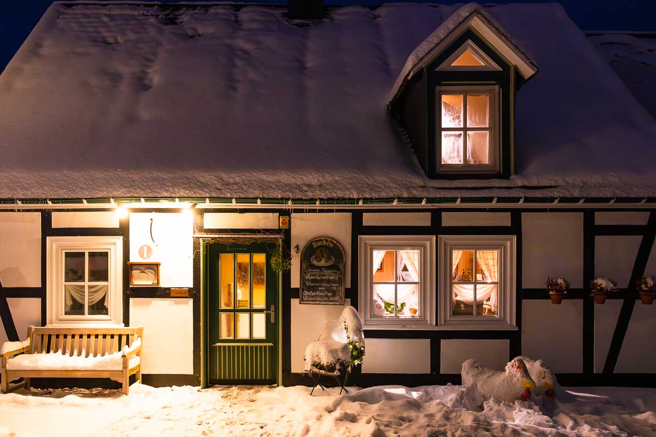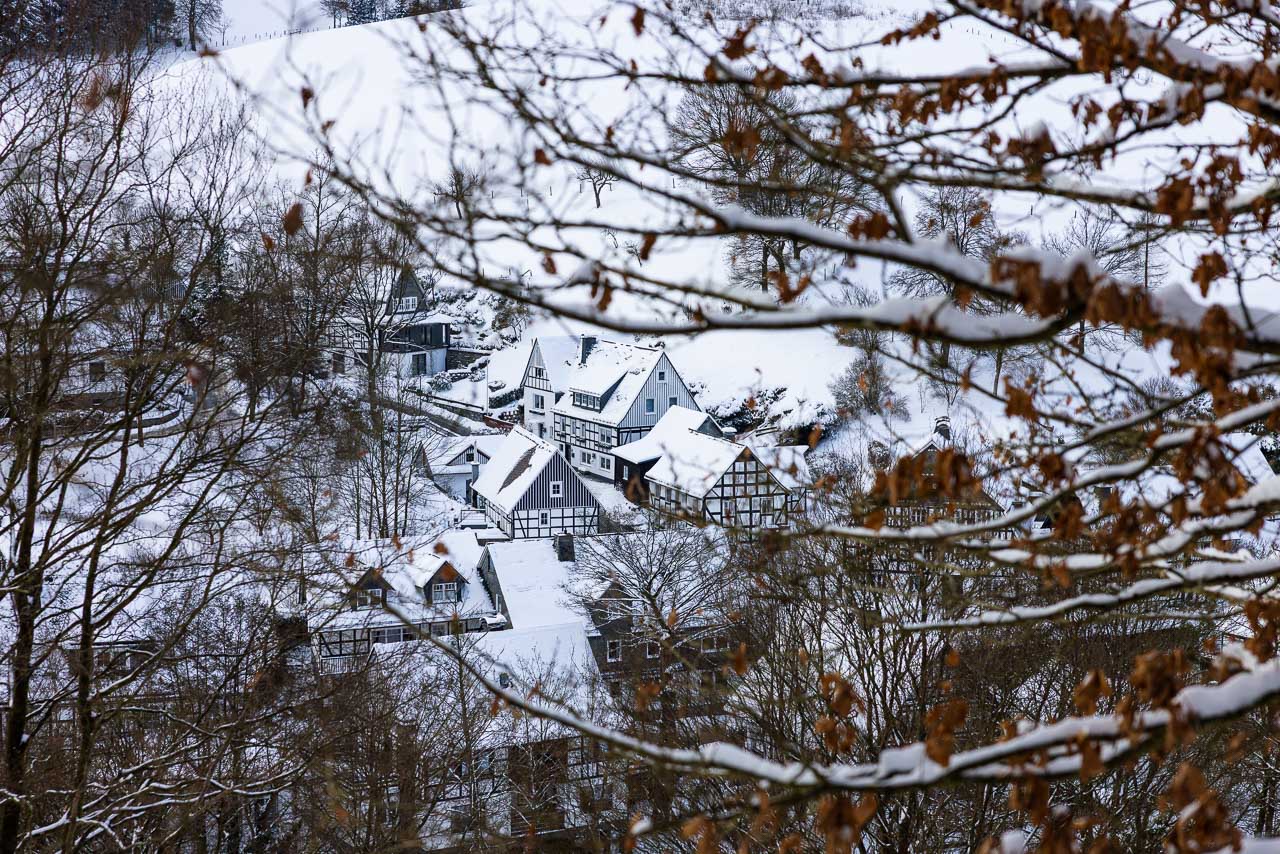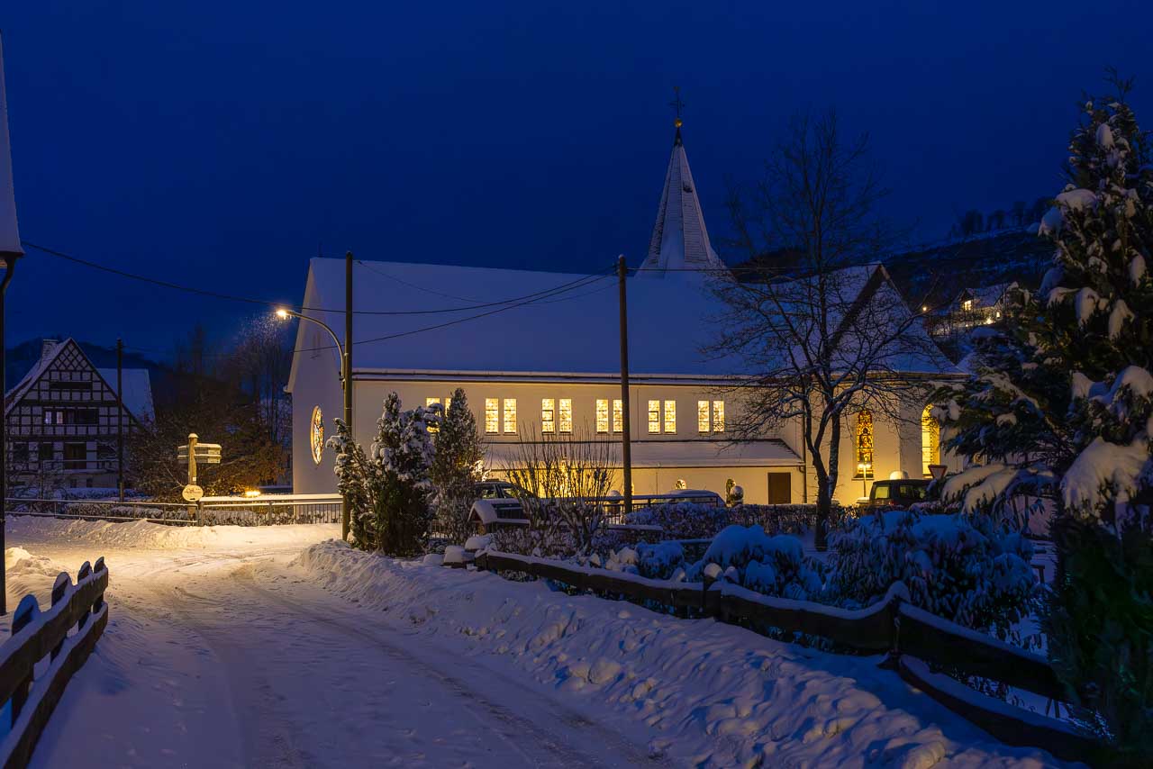 Westfeld liegt eingebettet im Tal der Lenne und ist das erste Dorf, das der Fluss auf seinem Weg durchquert. Es zählt sicher zu den schönsten Ecken im Schmallenberger Sauerland. Vor allem im Winter macht die Kombination aus gepflegtem Fachwerk und der verschneiten Landschaft den Ort zu einem echten Hingucker. Ich mag besonders die Stimmung während der blauen Stunde. Vor einigen Tagen bin ich direkt nach einem Schneeschauer losgegangen, genau als die Dämmerung einsetzte und sich der Himmel in dieses tiefe, kühle Blau färbte. Da die Straßen noch von einer dünnen Schneeschicht bedeckt waren, sah das Ganze einfach herrlich aus – die Stimmung war in diesem Moment noch schöner als sonst. Es war einer dieser Augenblicke, in denen das Dorf eine ganz besondere Ruhe ausstrahlte, die man am liebsten festhalten möchte.